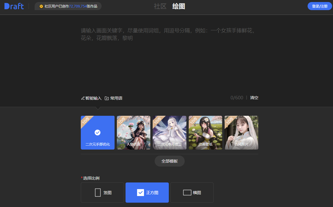 创作方法同样是输入关键词描述,选择模版、比例和数量 (选择性上传参考图)