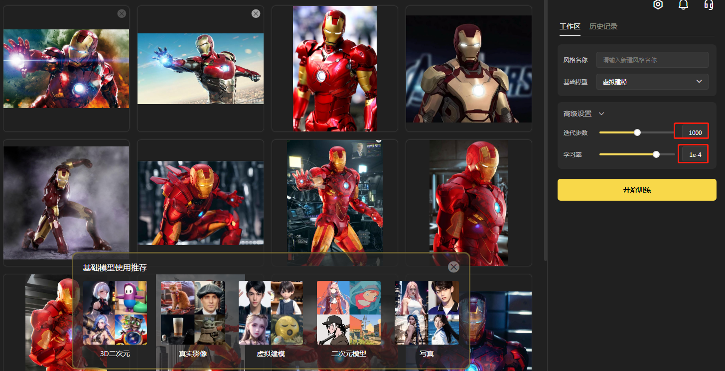 选择工作台左手面的风格定制 ,导入准备好的图片,然后在右手边工作区内为它起一个名字,其他参数我们保持默认,然后点击开始训练 。
