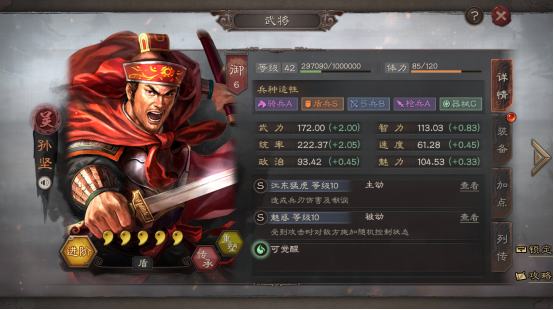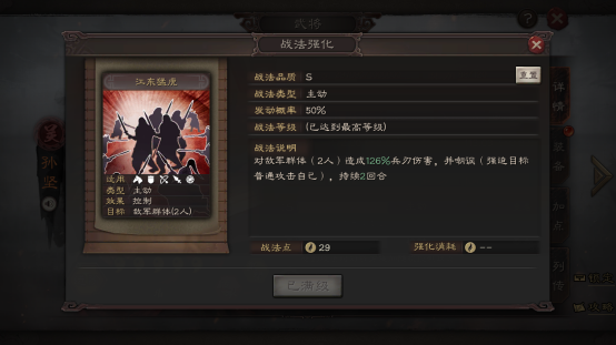 我们在使用孙坚开荒时,优先使用战法点将孙坚自带的战法升到满级。