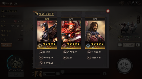 开荒武将分为主将和副将两种,一般副将的统御值较低,或者充当一个工具人的角色。开局队伍搭配主将关平搭配副将孙坚(6元首冲送的),在后面开启第二副将时,可以查看自己有什么武将进行候补。