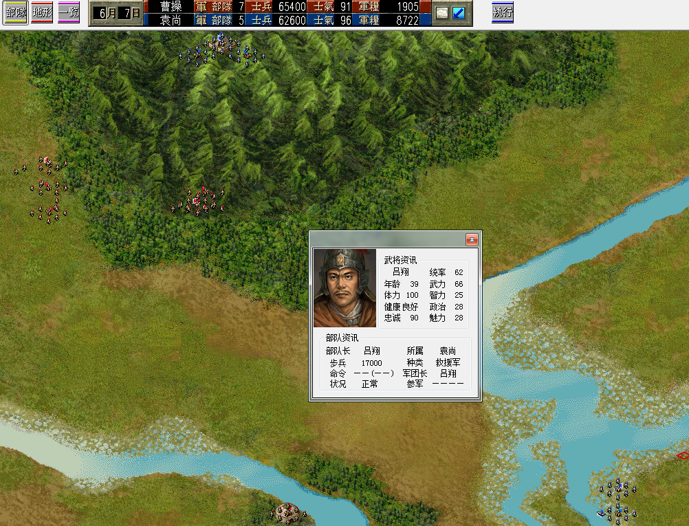 前面说到袁尚有多达16万兵力,那么小编6.5万还不到人家的一半,够吗?这个曹操是做过功课的,邺城守军5万兵,旁边的濮阳、晋阳或南皮都是3万,但是三国志6的自己势力只能1座城派出援军,并且一般不会全部派来,因此估计援军2万,合共7万,和曹军大致相当。燃鹅曹军将领素质高,加上合适的操控,足以抵消这些差距。