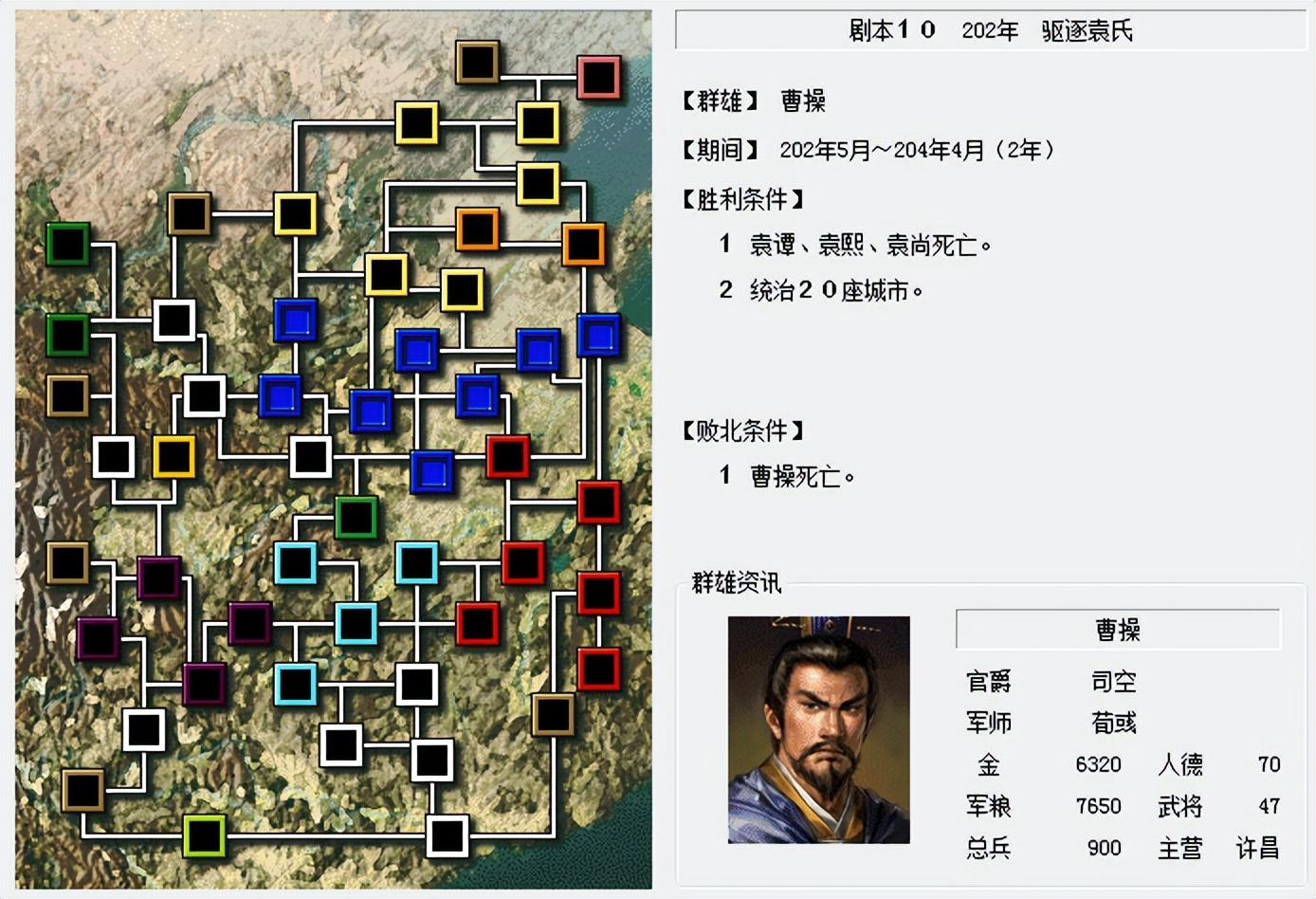 剧本10使用的群雄是曹老板,之前9个剧本除了第2《吕布讨伐战》之外,很多时候曹老板都是对手,这次居然能给我们使用,暗耻会这么好?而且剧本还是在曹老板一生最恐怖对手袁绍死后,袁氏分裂的时期,总感觉肯定有陷阱。但不管如何,剧本10我们是一定要通关了的,曹老板的武将素质,再加上开局多达8座城池+拥戴汉献帝,应该是谁都不怕的节奏。何况我们还有9万兵。