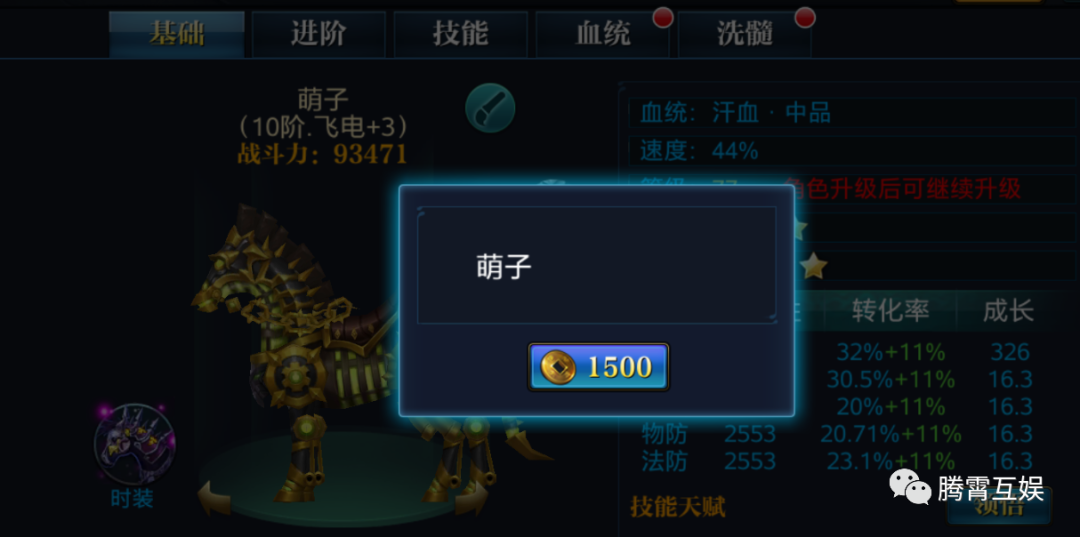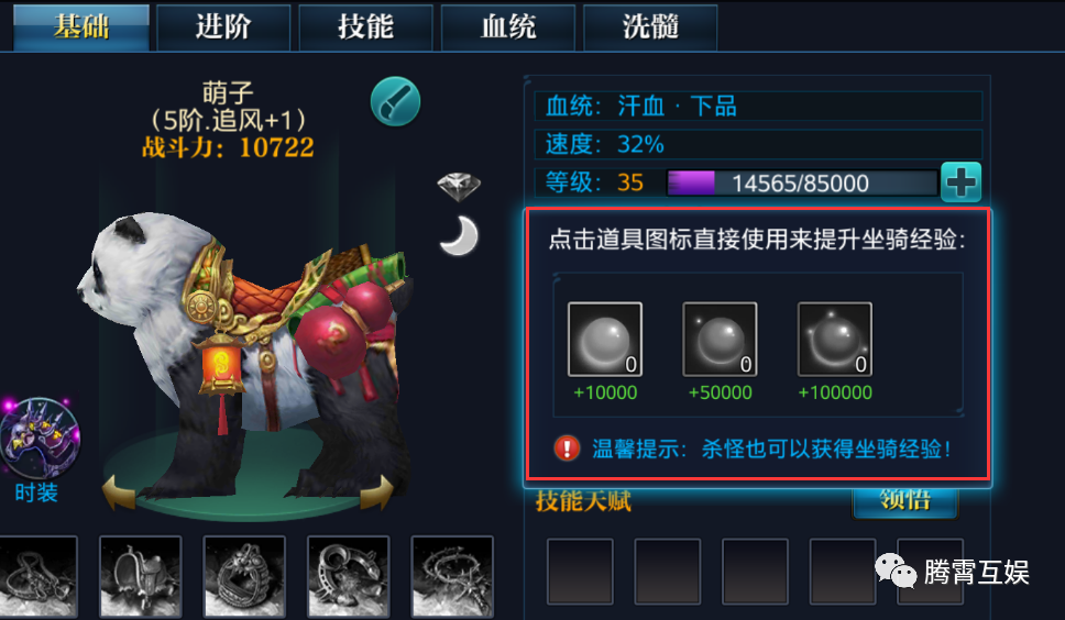 坐骑的属性需要通过转化后才能加成给角色,转化率越高,加成给角色的比例越高消耗洗髓丹给坐骑洗髓,可以改变坐骑的转化率洗髓的时候,每条属性的转化率都可能提高或降低,请确定是你想要的属性之后在保存,可以用洗髓锁来锁定一条或多条转化率,使其在洗髓的时候不变化,锁定后每次洗髓都会消耗洗髓锁图片来源于微信公众号:腾霄互娱