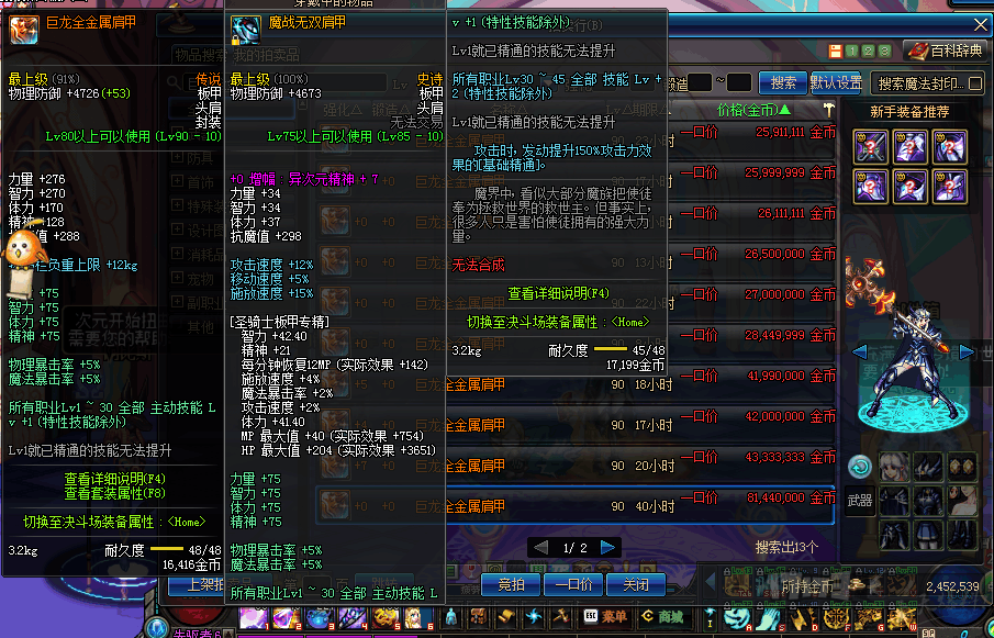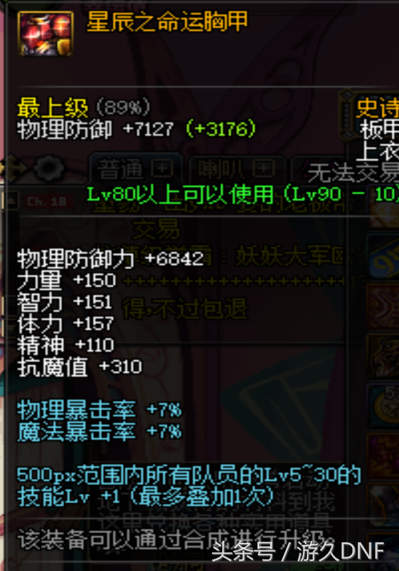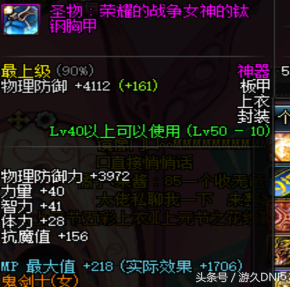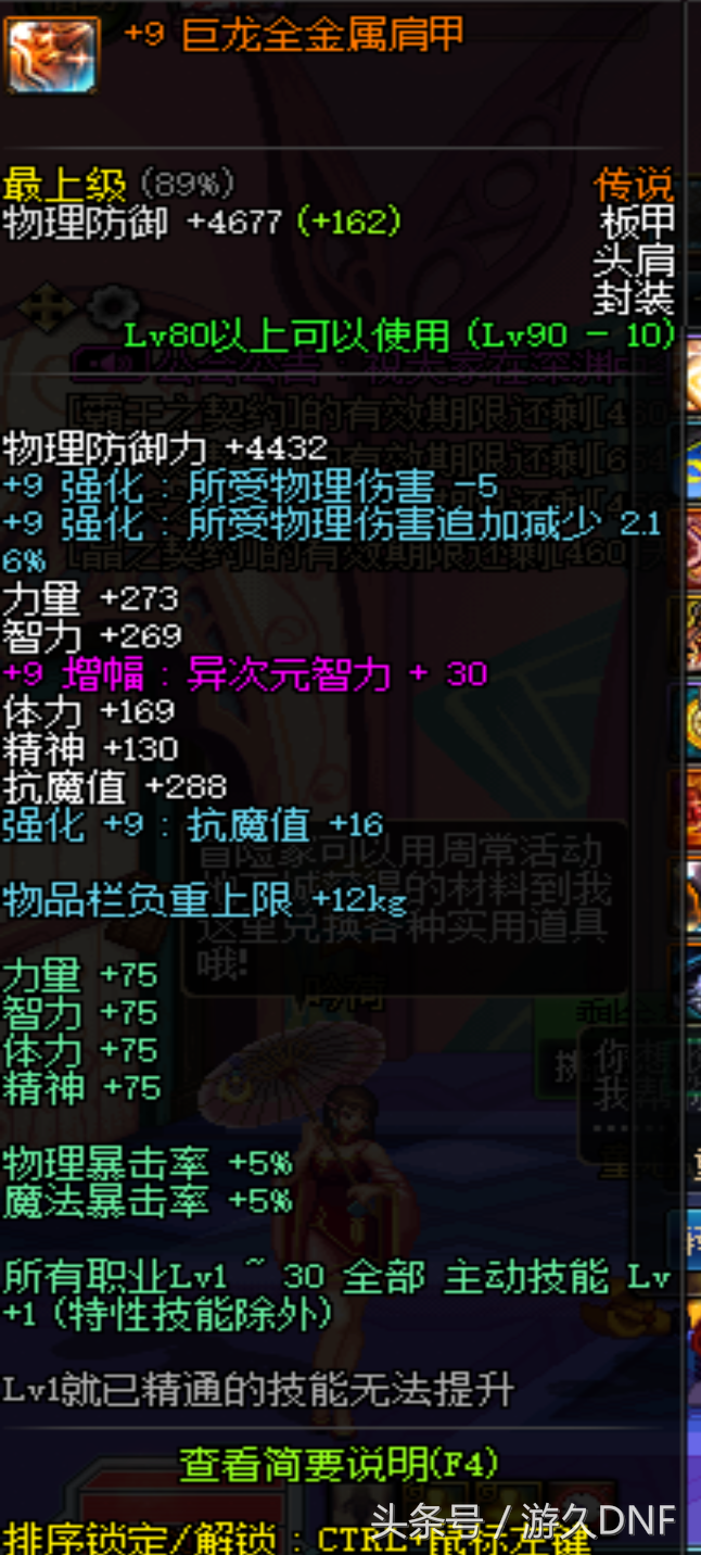也可以用。如果深渊刷不到,资金充裕的玩家建议买个巨龙全金属肩甲,带宝珠更好,这个投资是暂时性的,等你装备达标了封上卖钱即可,有宝珠的封上会比较划算些,不然传说狗眼都比肩甲值钱了。如果资金不够,也不要紧,做遗迹板甲肩膀就可以了。这里因为他有球手肩,所以直接带着就OK了。
