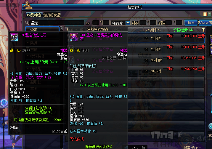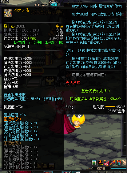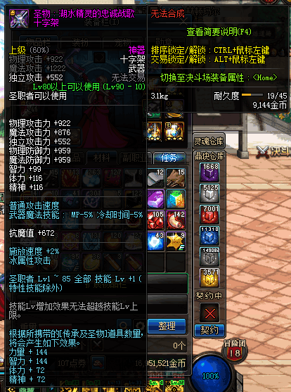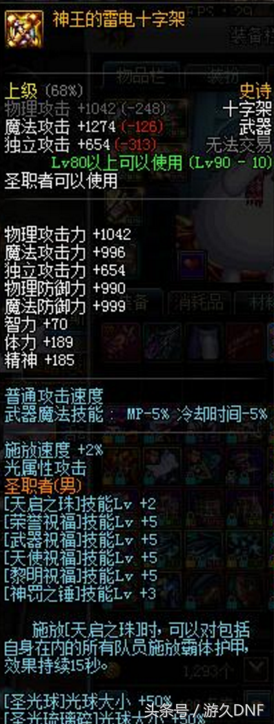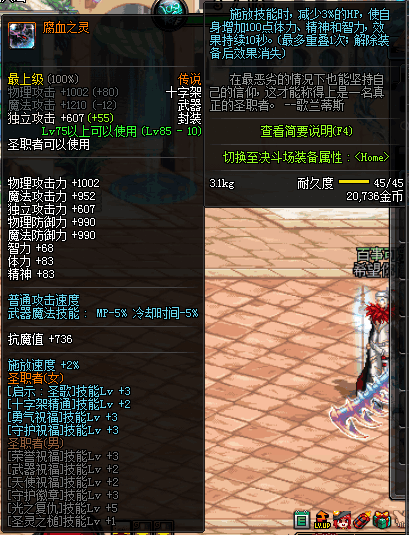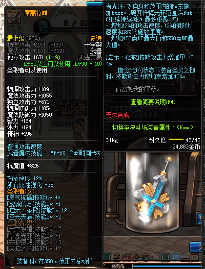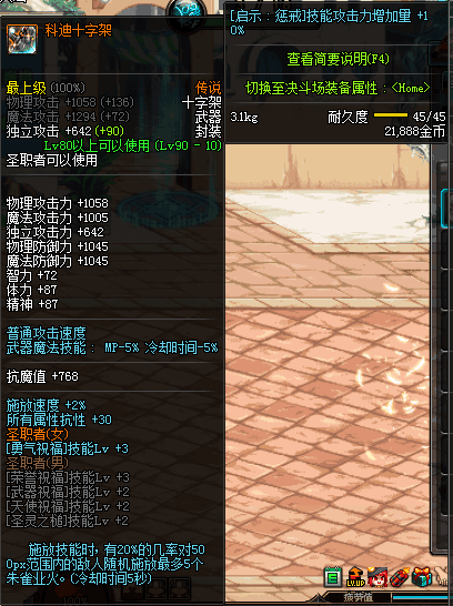 这是我最喜欢用的一把十字架,虽然说等级低了些,智力加成比较少,但勇气祝福等级加了2级,而且拍卖行价格不到50W,还是可以用来先过渡一下的。